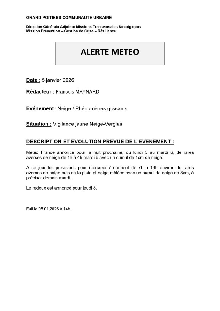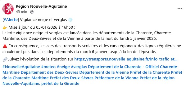 Le département de la Vienne vient de passer en Vigilance ORANGE NEIGE VERGLAS pour demain mercredi 7 de 6h à…